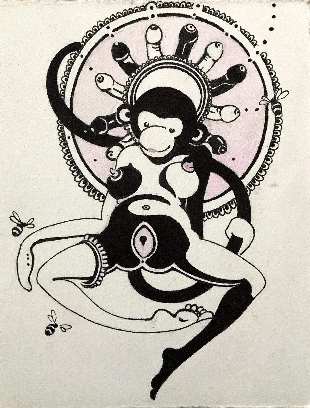 The monkey is represented here as a totem reminding us of lightheartedness, untamed nature, and compassion. It offers us good luck, swinging its tail as a symbol of balance. Sexuality and self-love have for us become taboos constraining our bonds with others, limiting our abilities to express ourselves, creating shame and distrust. Offering a space for conversation, I hope to empower through love, to encourage laughter, joyful bliss, and the beauty in our natures to heal.